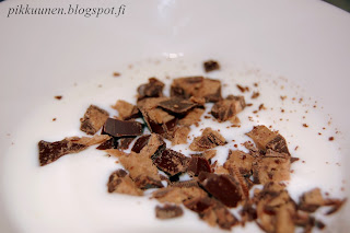 Leikkasin suklaat pieniksi ja ripottelin ne maustamattoman luonnonjogurtin päälle. Ja oli muuten ihan älyttömän hyvää. :) Ja tällä tavalla jogurtissa ei ollut mitään ylimääräistä ja ainoa "pahe" tässä oli tuo suklaa.